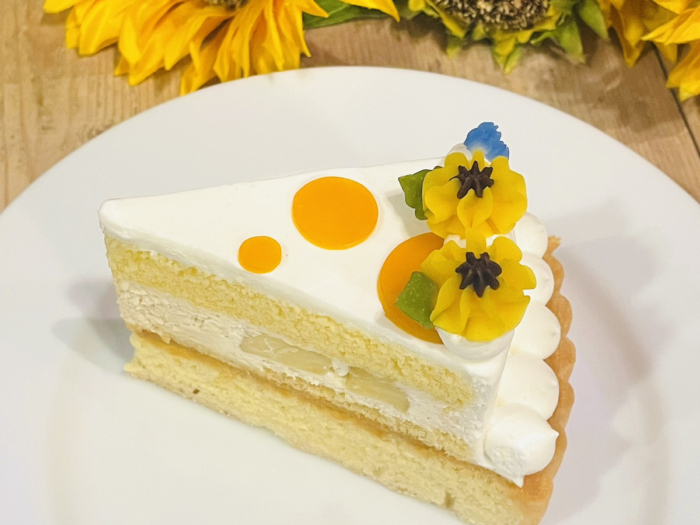 夏限定のひまわりのケーキは毎年味や見た目が少しずつ変わるんですが今年はキャラメルクリームとパイナップルがサンドされたショートケーキみたいなアーモンドタルトでした🌻