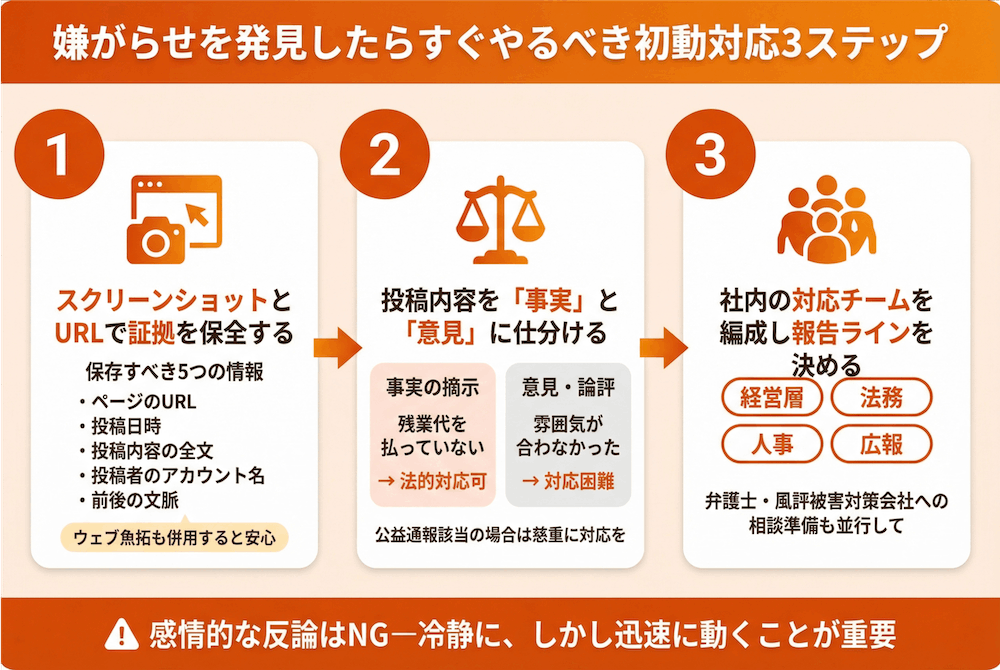 ネット嫌がらせは発見後の初動が勝負。証拠保全・内容分析・チーム編成の3ステップを迷わず実行し、感情的な反論は厳禁です。