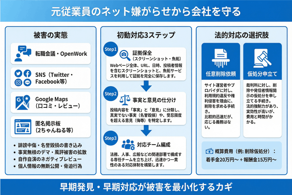証拠保全から法的措置まで、対応の全体像を一枚で把握。弁護士費用の目安も確認して、早期に専門家へ相談しましょう。