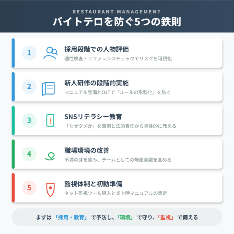 本記事では、飲食店におけるバイトテロを防ぐための5つのチェックポイントを、採用から教育、環境整備、そして万が一の備えまで、多角的に解説してきました。