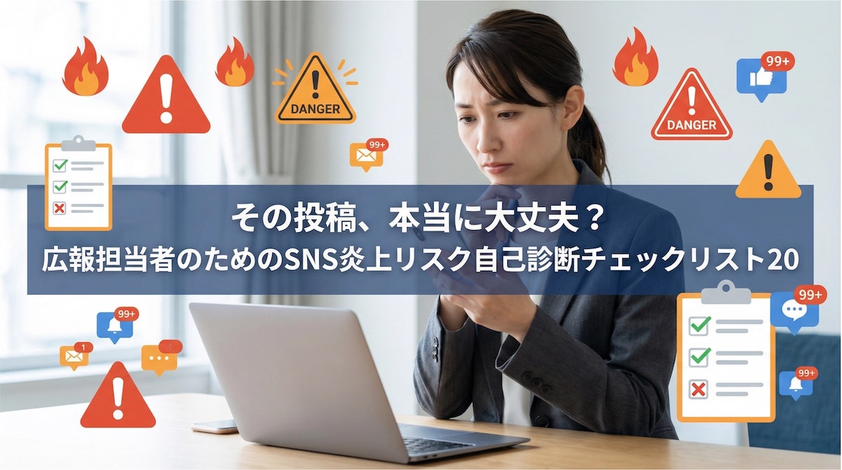 「うちの会社は大丈夫」と思っていても、決して他人事ではありません。そこで本記事では、広報担当者の皆さまが投稿前にご自身でリスクを診断できる「SNS炎上リスク自己診断チェックリスト20」を、具体的な事例や対策とともにご紹介します。